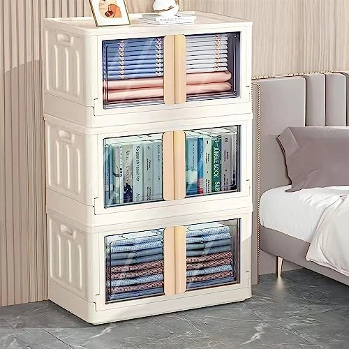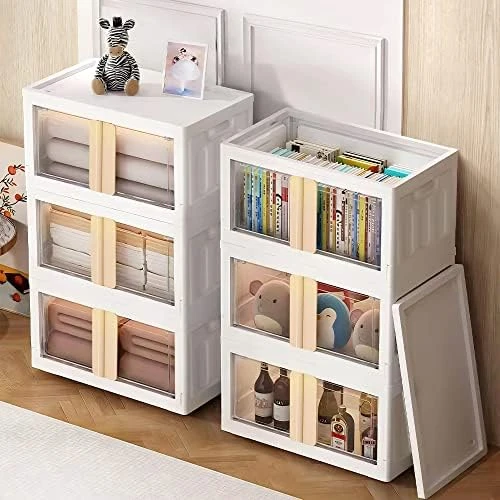 - [Versatility & Installation free]:The Folding Storage Box is easy to install without tools,and foldable in just 5 seconds. You can also see what’s inside more easily due to the clear doors.