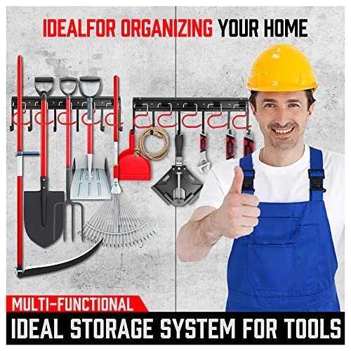 - 𝗩𝗘𝗥𝗦𝗔𝗧𝗜𝗟𝗘 𝗢𝗥𝗚𝗔𝗡𝗜𝗭𝗔𝗧𝗜𝗢𝗡 – Perfect for garages, basements, or sheds, this hanger tidily stores mops, shovels, brooms, and various yard tools with non-slip vinyl-covered prongs.