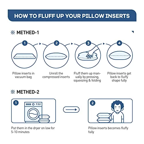- PACKAGE TIPS: 2 pack 16×26 inches pillow inserts are included. The package comes with a vacuum bag but restore most of its shape in seconds when you open the package. You can fluff them up manually to its full size by pressing, squeezing and folding. Or put them in the dryer on low for 5-10 minutes to get it back to its normal full fluffy shape. If you want your pillows looks fluffy, we recommend your pillowcases are smaller than the pillow inserts.