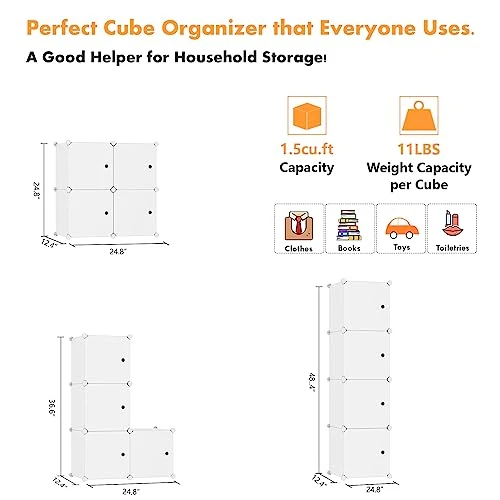 - HIGH QUALITY MATERIAL: Made up of high quality ABS connector and PP plastic panel, this cube organizer will be harmless to both you and your pet; waterproof, easy to clean, 11 lbs load-bearing on each cube, easy to move around