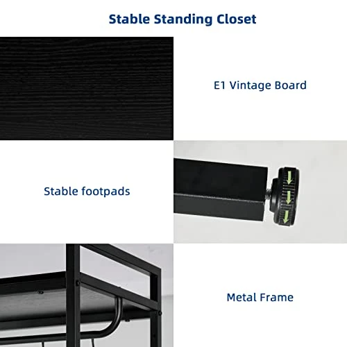 - 【Unbelievable weight capacity】 The combination of heavy metal frames and thick plates makes IT super stable and strong. Large heavy boxes are placed on the top to increase storage, free standing closet without swinging and collapsing. Become the ideal choice of long-term closet storage organizers. The weight capacity is 300 pounds for hanging racks for clothes . Four hooks are very convenient to place your hat, scarf, etc.