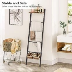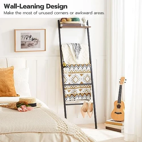 - Leanning Ladder Design: Approximated Dimensions: 16.1 X 7.9 X 61.4 inches. This leaning blanket ladder is both a beautiful decoration and super practical storage shelf. Four metal bars are convenient for decluttering blankets, quilts, towels and magazines. Plus, the top shelf can firmly hold green plants, books and other trinkets