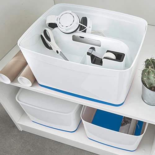 - Contents: One Leitz storage box, large, opaque, white/blue metallic, plastic, MyBox, WOW Range, dimensions (W x H x D): External: 31.8 x 19.8 x 38.5 cm, internal: 24.3 x 19.8 x 31.8 cm, 18 Litre, 52164036