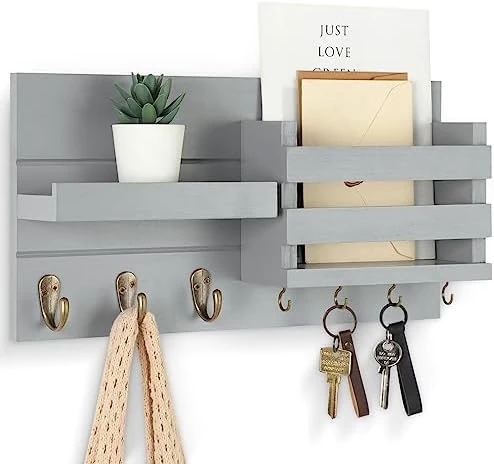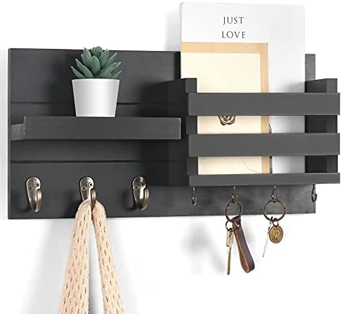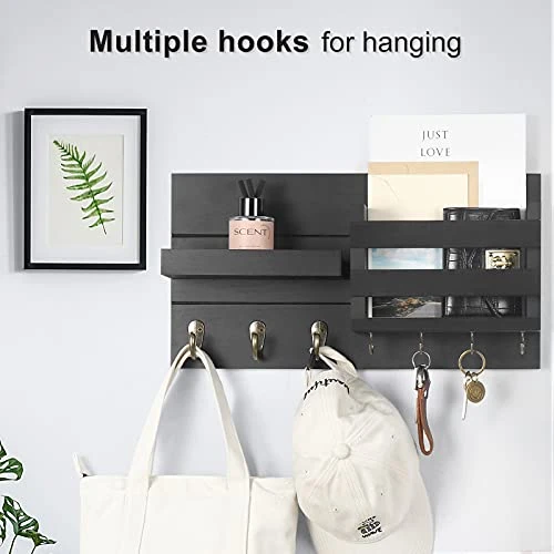 - 3 UPGRADED HOOKS allow our wall mail organizer to hold heavy objects such as winter coats, bags, umbrellas and dog leashes. Four key hanger hooks and a shelf keeps sunglasses handy at the front door.