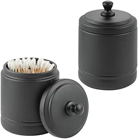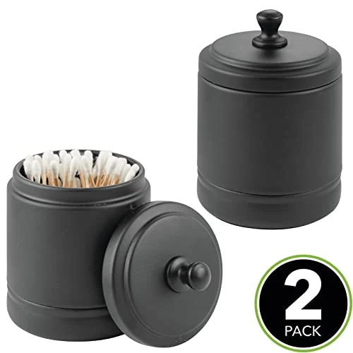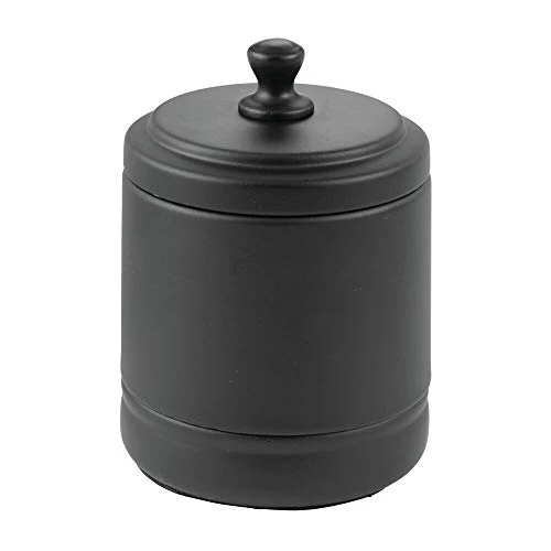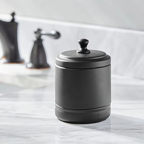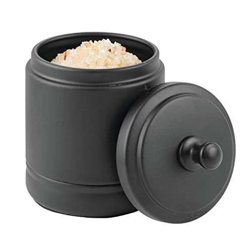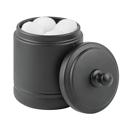 - KEEP IT NEAT: The vanity jar has a removable lid and a wide mouth to make accessing bathroom necessities and accessories simple; This canister is great for storing and organizing cotton swabs, ovals and rounds, makeup applicators, cosmetic sponges, wedges, guest soaps, bath bombs, balls, salts and more
