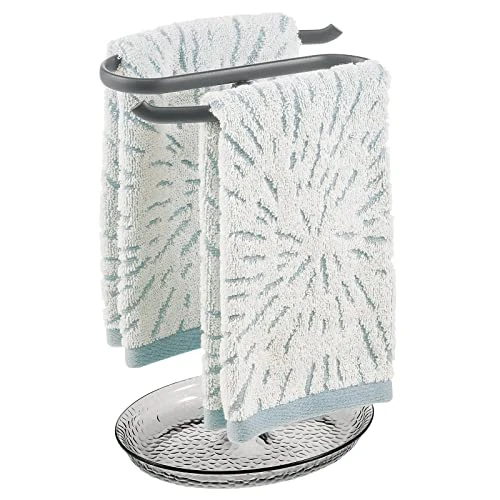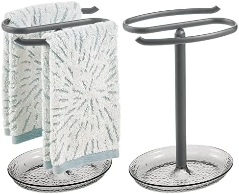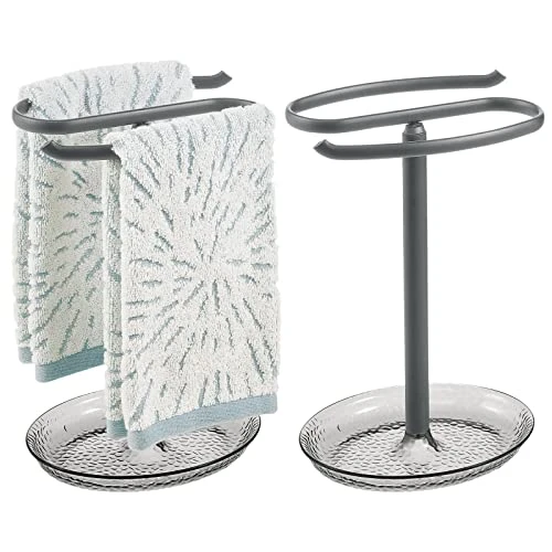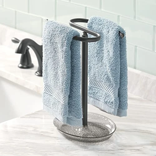 - FUNCTIONAL & VERSATILE: Provides smart, compact storage while adding a touch of style to any bathroom environment; Use one in every bathroom throughout your home to make towels conveniently accessible for you or your visiting guests; Please note that this item is intended for mini fingertip towels that usually measure 18 inches long when flat, folded they will hang down approximately 9 inches, fitting perfectly on this small towel stand