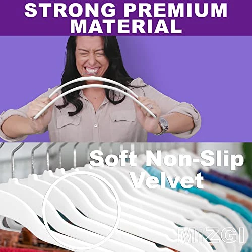 - ✔【Super Strong】- MIZGI huggable velvet hangers with 2023 NEWLY improved quality made of premium grade plastic. Rest assure that it will steadily hold even the heaviest clothes in your closet, can hold large capacity from 5kg to 8kg(11lbs to 18lbs).It is stronger and much lighter than wooden suit hangers but sturdy to hold heavy coats without getting bent
