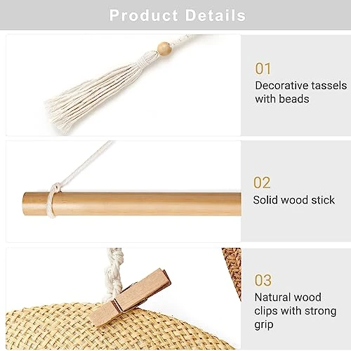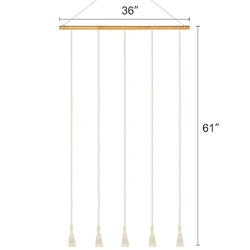 - Package: 1x Hat Hanger with 5 Ropes, 18 x Wooden Clips. Size: The wodden rod is 36″L, length from rod to the bottom of tassel is 61″L. Totally hanging rack:70.5″H. Wooden Clips: 0.43″ x 1.77″.