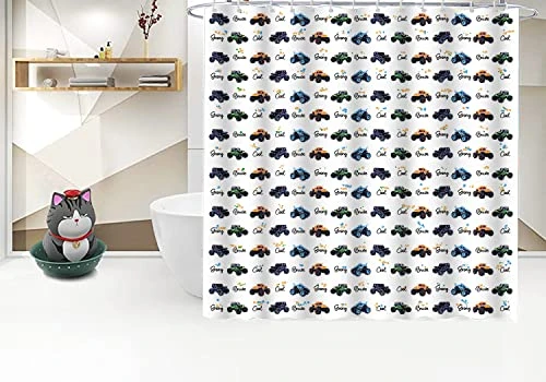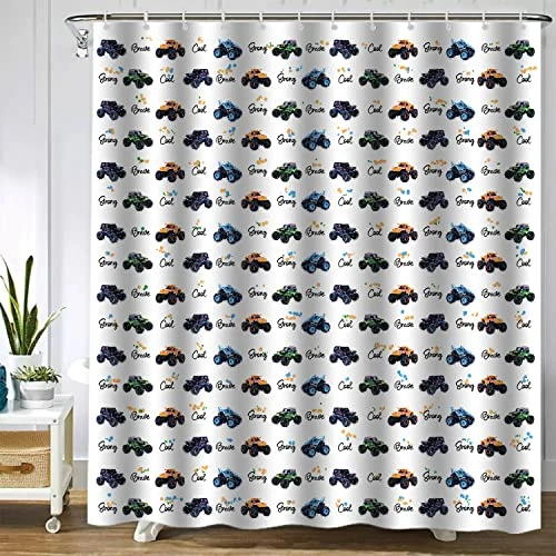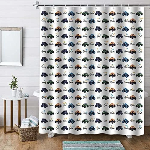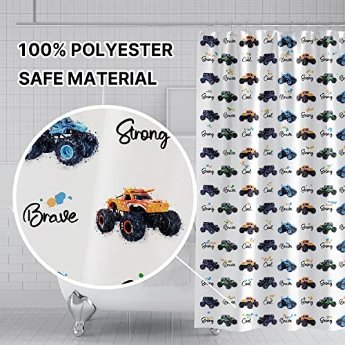 - 🚗【Monster Jam Truck Shower Curtain for Kids Bathroom】High-definition printed vivid colorful cute cartoon car patterns with inspirational words, these boys bathroom accessories could bring a sense of creative and unique to your children bathroom decoration, make them enjoy their bath time. Monster trucks shower curtain can be use in home bathroom, bath tubs, dorm, hotel, gym, apartment, hotel, school dorm bathtubs or blend in as camper backdrop, window curtains, wall decor for decorations.