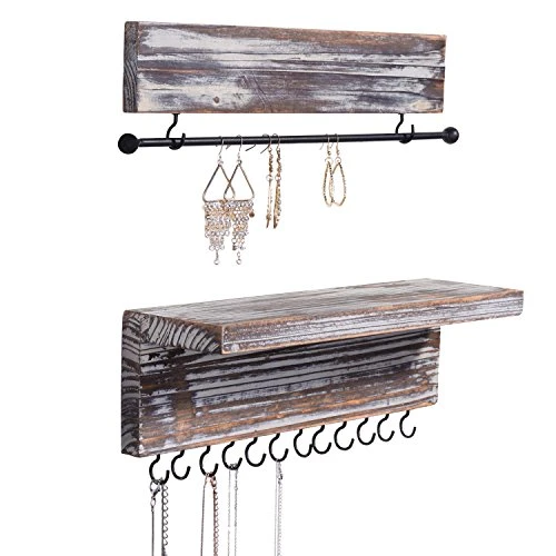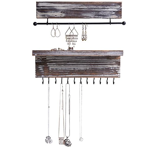 - 12 metal hooks and a removable bar can be used to hang necklaces, bracelets, hook earrings and rings