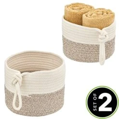 MDesign Casual Round Woven Cotton Rope Bathroom Basket With Tie Handles – Storage Organizer Set For Countertop, Floor, Closet Or Vanity, Holds Toilet Paper, Towels, Or Magazines, Set Of 2, White/Brown