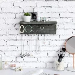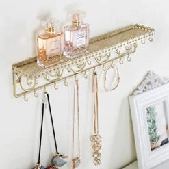 MyGift Gold-Tone Metal Wall-Mounted Jewelry & Cosmetics Shelf With 25 Necklace Hooks