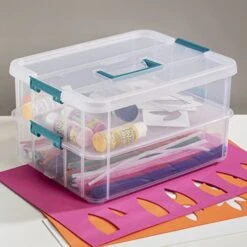 Sterilite 1427CLR Stack & Carry – 2 Layer Box, Clear Lid & Blue Handle, See-through Layers