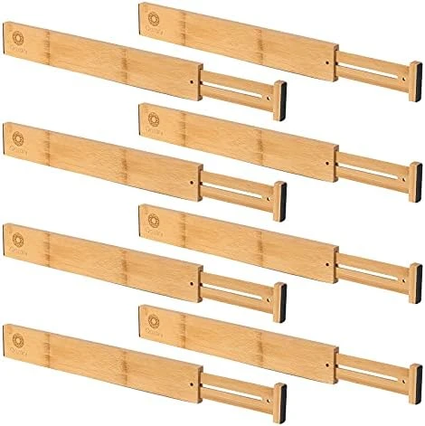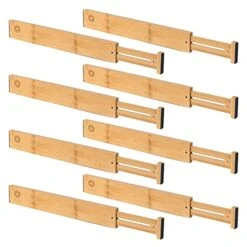 - EXPANDABLE SIZE TO FIT MORE DRAWERS: Come in packs of 8, each bamboo wooden drawer dividers measures 17″/43.3cm x 2.28″/5.8cm x 0.59″/1.5cm high, adjustable from 17″ to 22″ in length, advised to use with drawers measure from 17.2″ to 21.5″.