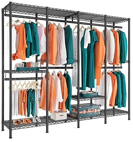 - 【990LBS METAL CLOTHING RACK WITH 76“ WIDE HANGER】: The clothes racks for hanging clothes has 6 shelves and 4 hangers. The longest hanger has a span of 76 inches, which can hang about 250-300 summer clothes or 80-100 winter clothes. Each hanger rod can hold 66 lbs, and the longest hanger canm hold 132LBS. Each shelves can hold up to 88 lbs, which can hold at least 2 24″ suitcases.
