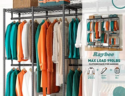 - 【PERFECT SIZE & SAVE SPACE】: The size of the raybee clothing rack heavy duty is 76″ Wx 18″D x 77″H. The 77″ height allows you to hang two layers of adult clothes and keep them wrinkle-free. The 76inch wide hanger allows you to hold quite a lot of clothes. You can place your portable clothes rack in different rooms, such as the closet, bedroom, etc
