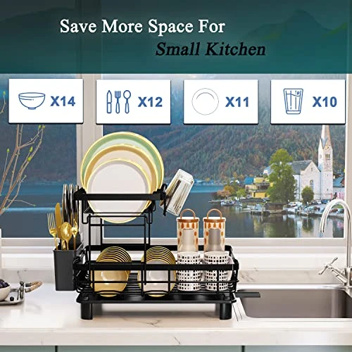 - Maximize your kitchen space: With this double drainer rack, you can store up to 10 plates and 4 glasses on the top shelf and 20 bowls on the bottom shelf. It also comes with side racks for utensils. Perfect for smaller kitchens that need more working space. No more cluttered kitchens