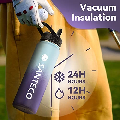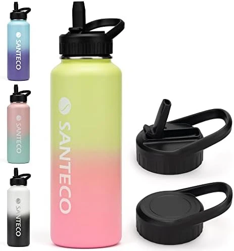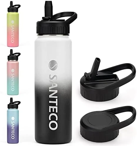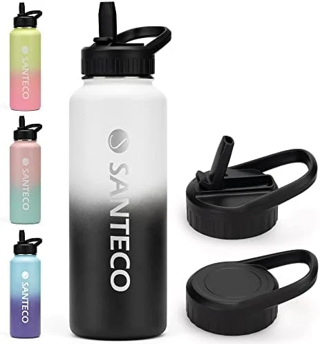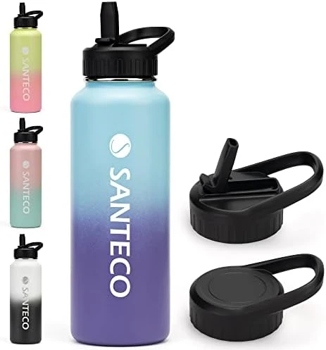 - Multiple Size & Color Options SANTECO insulated water bottle perfectly meets your comprehensive drinking needs from 24oz to 64oz. With the latest gradient colors applied on the premium powder coating materials. Outfits in both the function & looks. What’s more, the drinkware accessories also help to better your drinking. SANTECO is worth your try.