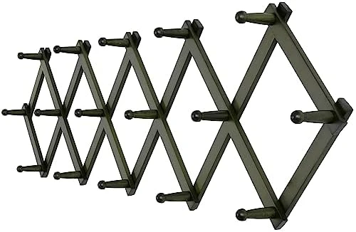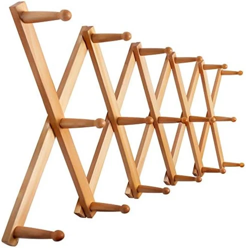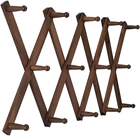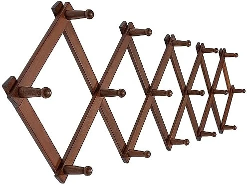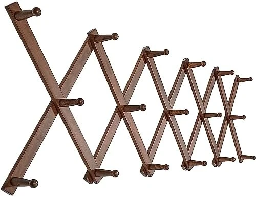 - 【Large Space Saving】Accordion wall hanger walnut,a nice darker color & 3/8” thick.16-inch length, maximum extension to 57 inch wide, larger hat rack for wall.
