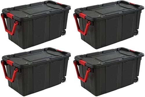 STERILITE 14699002 40 Gallon/151 Liter Wheeled Industrial Tote, Black Lid & Base W/Racer Red Handle & Latches, 4 Pack