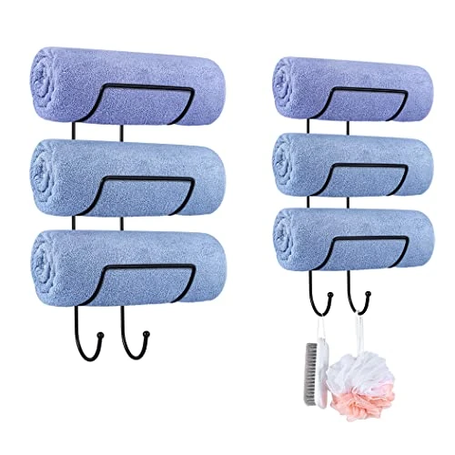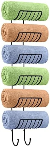 - 【Multi-Functional】- The towel holder could be used for towel storage in bathroom, and also used as yoga mat storage. The hook of towel racks could hang towels, bath balls, glasses, jewelries etc.