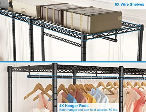 - [Massive Capacity]: With a load capacity of 780 lbs, 4 tiers 3 rows metal closet organizer system can hold most of your daily clothing and belongings. The hanger rods for hanging clothes, and the shelves for storing some folded clothing and storage box