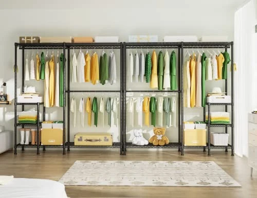 - LARGE CAPACITY: The 4 tiers freestanding closet organizer has 6 shelves to organize clothes and bed liners. There is an extra storage space on the upper shelves. Use the hanger rods to hang suits, coats, T-shirts, jackets, pants, skirts, dresses, and so on