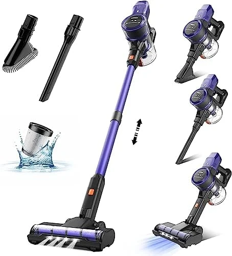 - RETRACTABLE WAND & RICH ACCESSORIES: The stick vacuum cleaner cordless features a retractable metal wand that can be adjusted from 36” to 46” to suit the most comfortable cleaning height of your own. It is lightweight so you can lift the wireless vacuum cleaner effortlessly to clean high places or with just 1 hand, even the elderly or the pregnant. Coming with various accessories, it can be assembled into 6 combinations to meet your various cleaning needs.