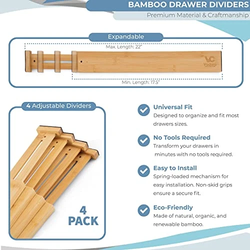 - Premium Material – Beautiful and elegant look. Each divider is made of natural, organic, and renewable bamboo wood. Premium craftmanship and sturdy construction. Easy to clean and maintain.