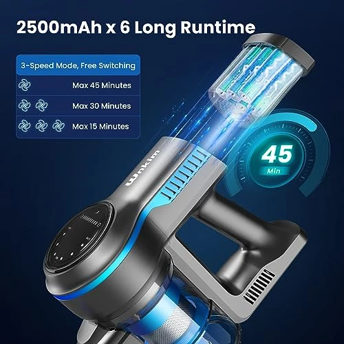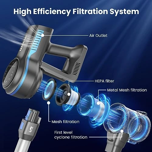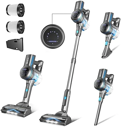 - FREE-STANDING DESIGN & LED DISPLAY: With self-standing design, you can stand the vacuum cleaner andwhere you want, no need to drill the bracket into the wall for hanging. The large LED display of this cordless stick vacuum helps you monitor the status of the vacuum cleaner better in real time, including battery levels, suction performance, suction blockage alert.