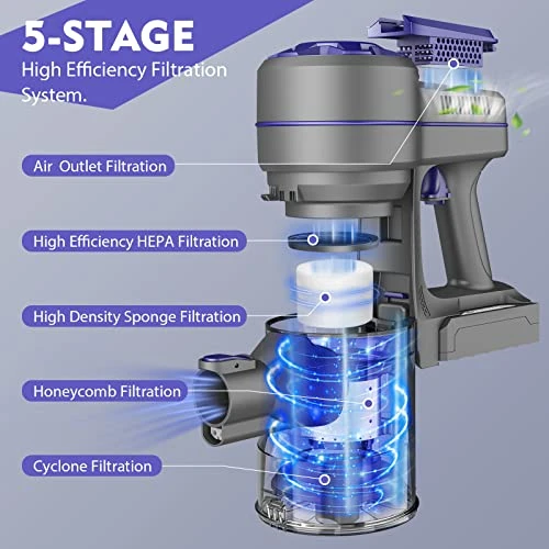 - ♻【Upgraded HEPA Filtration System】: Our cordless vacuum adopts a 5-stage high-efficiency filtration system, which can effectively capture 99.99% of tiny dust particles and avoid secondary pollution. It can provide purified air for your family. (Note: HEPA is washable, cleaning the filter regularly will prevent suction loss and clogging.)